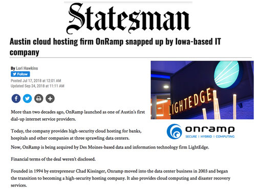 We had not one, but two exits in 2018. Our portfolio company OnRamp, an Austin-based data center and cloud computing company, was acquired by Des Moines-based IT company LightEdge. LightEdge now runs one of the largest interconnected data centers outside the coasts in key Next Coast markets. OnRamp didn’t just have a great suite of products, it was also led by two great entrepreneurs: CEO Lucas Braun and President Ryan Robinson. Helping them through the acquisition process and their excitement around thinking big made an exhilarating liquidity moment even greater — and reminded us of why do exactly what we do.